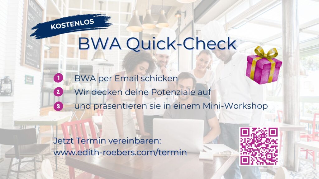 Am Vormittag ‚zerpflücken‘ wir deine BWA und am Nachmittag erarbeiten wir gemeinsam konkrete Handlungsempfehlungen für mehr Umsatz, weniger Kosten und mehr Gewinn.